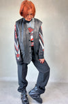 Hier gedragen op een smokingbroek en een oversized leren gilet.