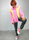 Met deze zwart/wit geruite broek met hoge taille kan je eindeloos combineren. Zoals hier met een stoere print shirt of juist een zuurstokroze blouse en butterly yellow gillet, beide verkrijgbaar in de webshop