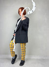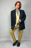 Deze soepelvallende zwart-geel geruite broek met groot ruitje kun je eindeloos combineren.Zoals hier met een geruit colbert een blouse met grote kraag een faux suede gilet en een stropdas. Al deze unieke items shop je bij ons.