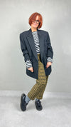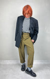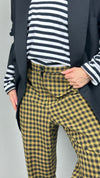 Deze soepelvallende zwart-geel geruite broek met fijn ruitje kun je eindeloos combineren. Zoals hier met een zwart/wit streep shirt (models own) en smoking jas welke ook verkrijgbaar is in de shop.