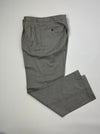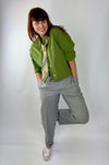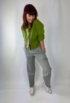 Happy vibe outfit. Mix van een grijze wide-leg vintage pantalon met een oversized groene blouse. De vintage stropdas geeft jouw look een eigenwijze twist (beide verkrijgbaar in de webshop).