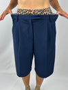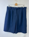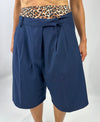 Deze bermuda krijgt een feestelijke vibe met een gouden, satijnen geknoopte blouse (verkrijgbaar in de shop). Wil je all out gaan? Combineer ’m dan met een hakje en color-block sokjes (model’s own)