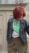 Dit korte leren motorjasje is superleuk om te combineren met een oversized broek.