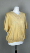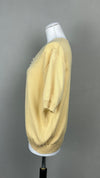 Botergeel truitje in ajour breisel. Lichte verkleuring maar nauwelijks zichtbaar.
