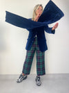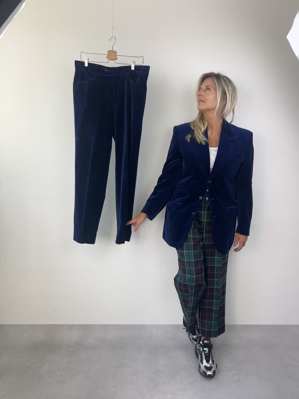 Weg met het stoffige imago van fluweel! Dit pak is bijna als nieuw en combineert verrassend tof met een geruite broek, zoals je hier ziet (ook verkrijgbaar in de shop).