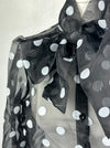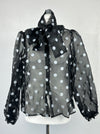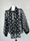 Deze transparante polkadot blouse heeft een leuke vibe die een totaal andere twist krijgt met een geruite blazer, dit unike item is ook verkrijgbaar in de webshop.