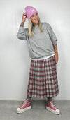 Deze geruite plissé rok met elastieke band maak je sportief met sneakers en een oversized sweatshirt (models own).