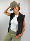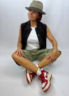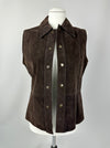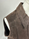 Bruin getailleerd suède gilet met drukknopen en kraag, van echt leer. Leuk te combineren met een driekwart cargo, verkrijgbaar in de shop.