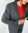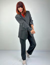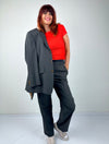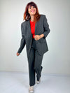 Dit soepelvallende kostuum valt mooi slank zodat het vrouwelijk blijft. Voor een leuke twist stijl het af met een rode top en een paar sneakers.